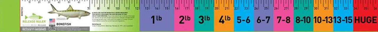 The Bonefish Release Ruler is designed to provide an estimated weight of your bonefish catch based on length. This ruler features contrasting color combinations that are ideal for taking photos of your catch. This ruler will allow anglers to be able to measure, remember, and release their catch after the long fish battle. It’s made from PVC material that’s stiff enough to lay flat on the deck but still flexible enough to be rolled up easily for storage. This ruler features a foldable nose section for accurate measurement.